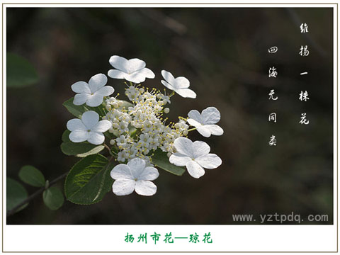 瓊花為揚(yáng)州市花,自古以來(lái)有“維揚(yáng)一株花,四海無(wú)同類(lèi)”的美譽(yù)。瓊花是我國(guó)特有的名花,文獻(xiàn)記載唐朝就有栽培,瓊花的壽命較長(zhǎng),揚(yáng)州大明寺內(nèi)一株清朝康熙年間種植的瓊花,已有300多年的歷史,如今依然繁茂,風(fēng)姿如故,風(fēng)韻仍不減當(dāng)年。它以淡雅的風(fēng)姿和獨(dú)特的風(fēng)韻,以及種種富有傳奇浪漫色彩的傳說(shuō)和逸聞逸事,博得了世人的厚愛(ài)和文人墨客的不絕贊賞,被稱(chēng)為“稀世的奇花異卉”和“中國(guó)獨(dú)特的仙花”。